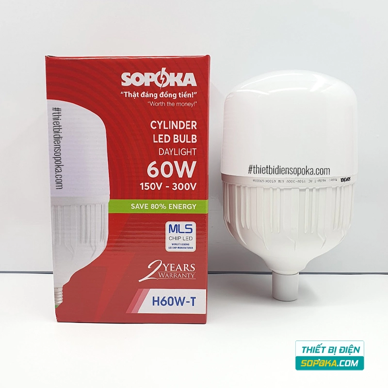 Bóng đèn LED trụ tròn dòng H SOPOKA là dòng bóng LED công suất cao (20W–60W) cho ánh sáng trắng 6500K, góc chiếu rộng 200° và quang thông công bố 115 lm/W. Thiết kế dải điện áp rộng 85–265V giúp bóng vẫn sáng ổn định khi nguồn điện yếu hoặc dao động. Thân bóng kín, chống nước và côn trùng; vật liệu bầu nhựa PC chịu nhiệt và thân nhôm đúc liền hỗ trợ tản nhiệt, hướng tới độ bền sử dụng lâu dài.