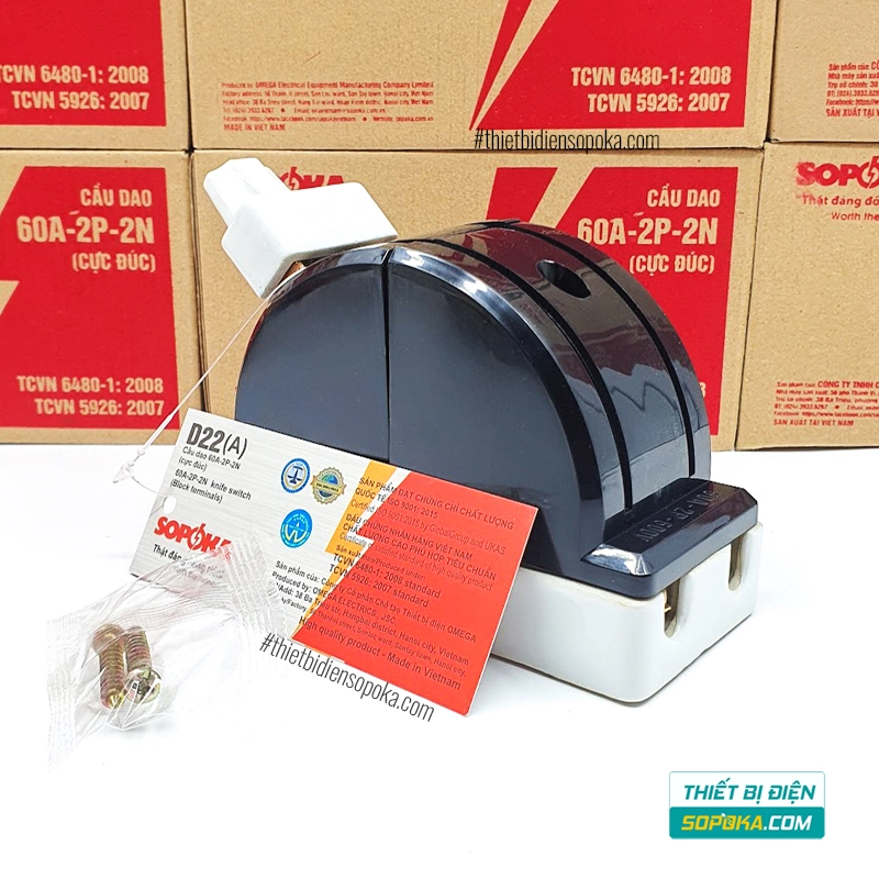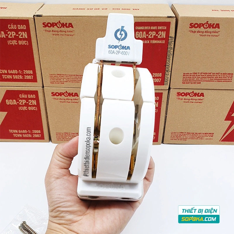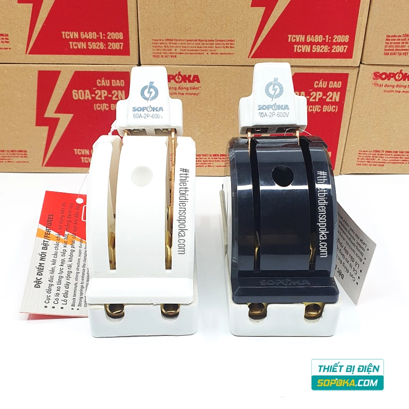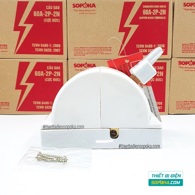 Cầu Dao Đảo Đế Sứ 1 Pha 60A 2P 600V 2N D22 SOPOKA là dòng cầu dao đảo bằng tay dùng cho hệ thống điện 1 pha cần chuyển đổi 2 hướng. Sản phẩm có 2 phiên bản màu trắng D22 và màu đen D22A, cấu tạo từ sứ, đồng hợp kim và nhựa ABS. Theo thông tin công bố, thiết kế tập trung vào khả năng chịu nhiệt, chống cháy, giữ tiếp xúc chắc hơn và giảm nhiệt phát sinh tại điểm tiếp xúc khi đóng cắt.