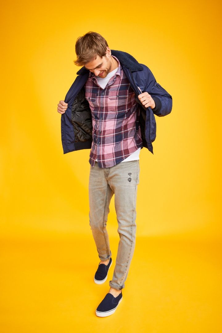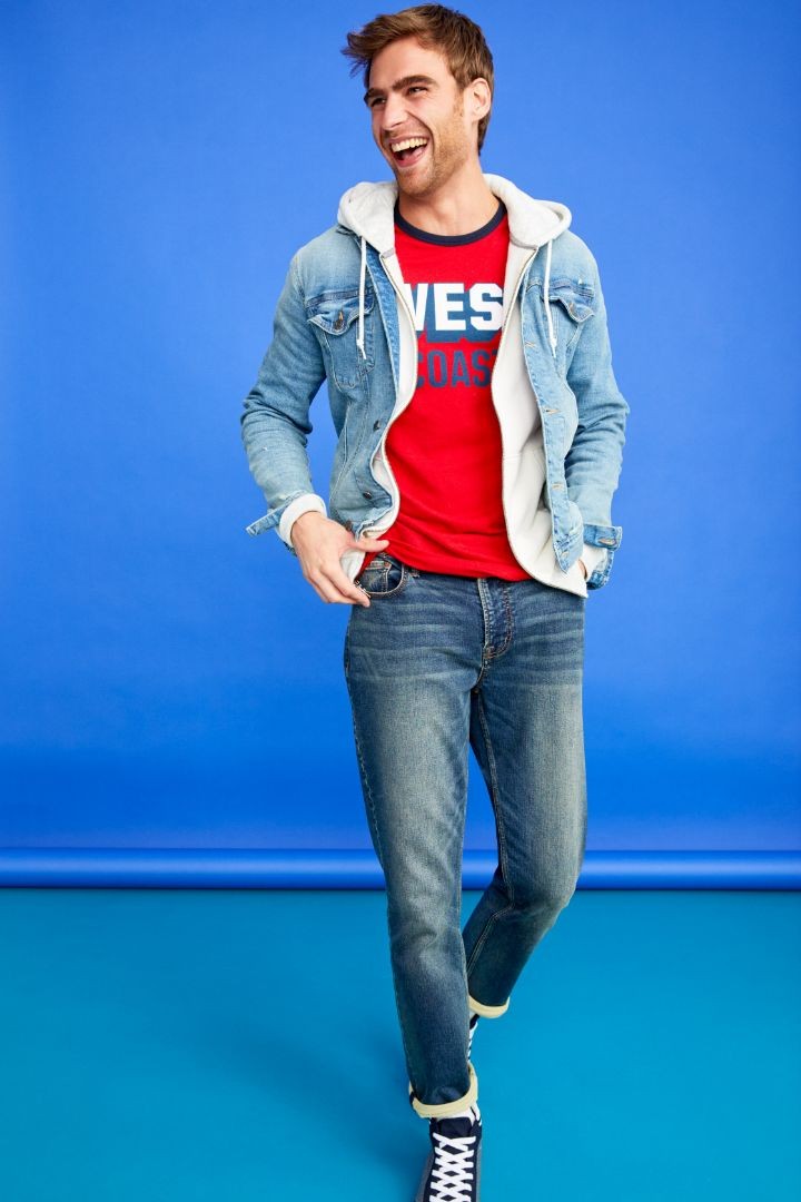 Một phom quần quá rộng sẽ khiến người nhìn liên tưởng ngay đến việc bạn vừa “thó” một chiếc quần từ tủ đồ của bố, vì thế hãy lựa chọn cho mình dáng quần slim-fit. Chỉ cần phối với một chiếc áo thun basic hoặc áo sơ-mi flannel là đã thể hiện được một hình ảnh trẻ trung, năng động. Chơi đùa thêm chút nữa với một đôi bốt (chẳng hạn như Chelsea boots hay Chukka) sẽ nâng cấp bạn lên thành một urban chic chính hiệu. Nếu yêu thích phong cách retro, bạn hãy kết hợp cùng áo phông họa tiết cổ điển, những chiếc áo sơ mi kẻ sọc và những chiếc áo bomber và áo thun đầy màu sắc.