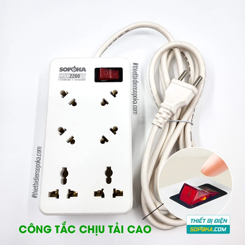 - Ổ cắm SOPOKA 6A2 dùng cho nồi cơm hoặc ấm siêu tốc được không? - Dùng được nếu tổng công suất các thiết bị cắm cùng lúc không vượt 2200W. Với thiết bị nhiệt công suất lớn, nên tránh chạy đồng thời quá nhiều thiết bị trên cùng một ổ.