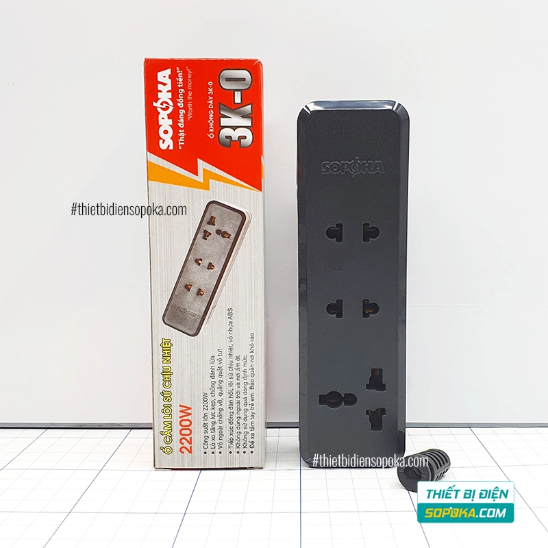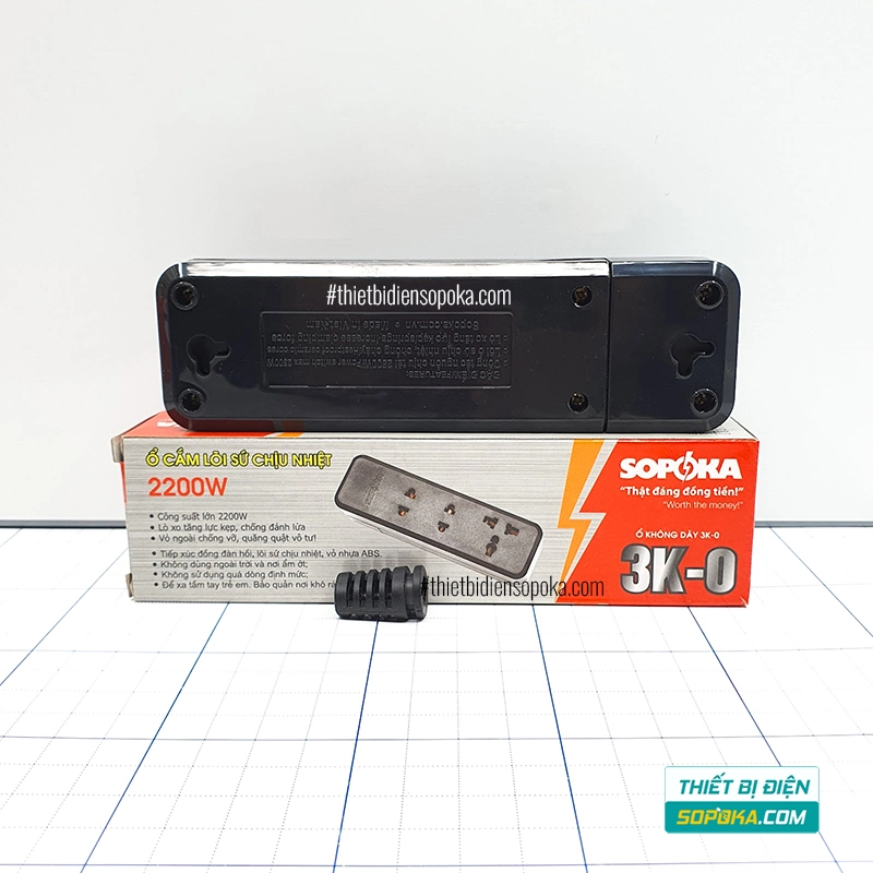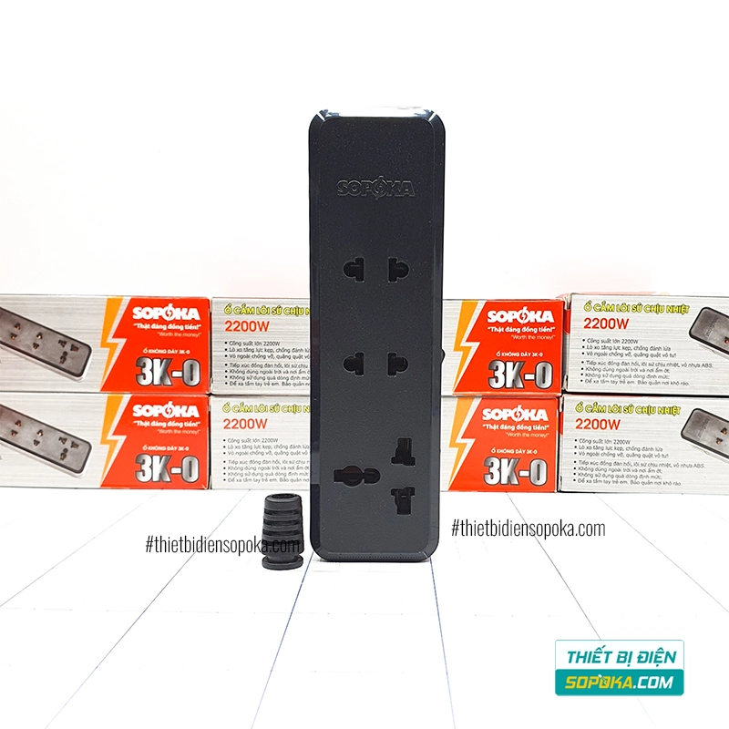 - Ổ cắm 3K-0 SOPOKA là loại gì? - Ổ cắm rời 3 lỗ, không kèm dây (0m), định mức 10A – 220V, công suất 2200W.