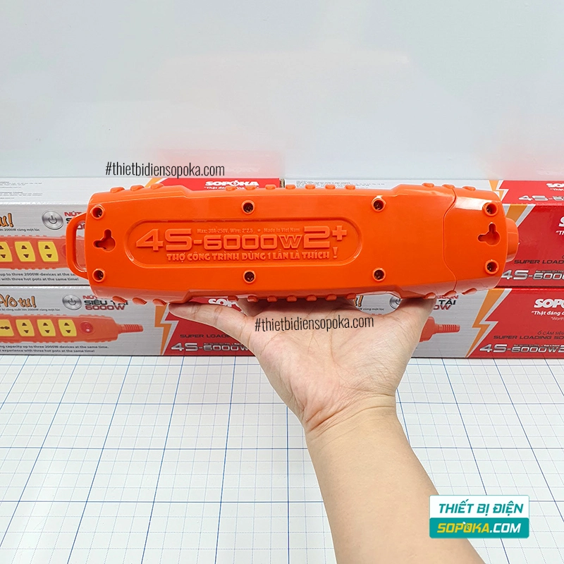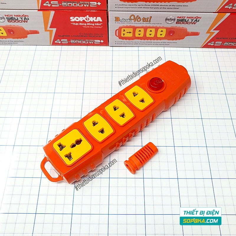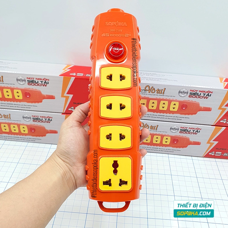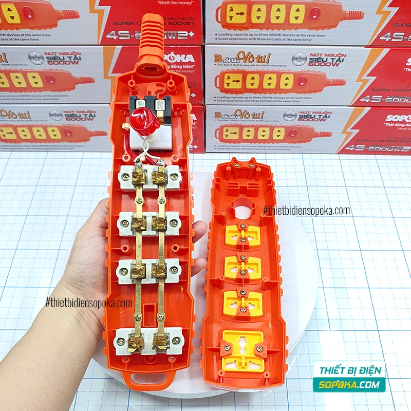 Nếu bạn cần ổ cắm rời 4 ổ – chịu tải đến 6000W – có nút nguồn riêng, 4S-6000W2+ SOPOKA phù hợp cho gia đình, xưởng và công trường. Thiết kế tự đấu dây, lõi sứ chịu nhiệt, tiếp điểm chắc giúp dùng ổn định với các thiết bị công suất cao.