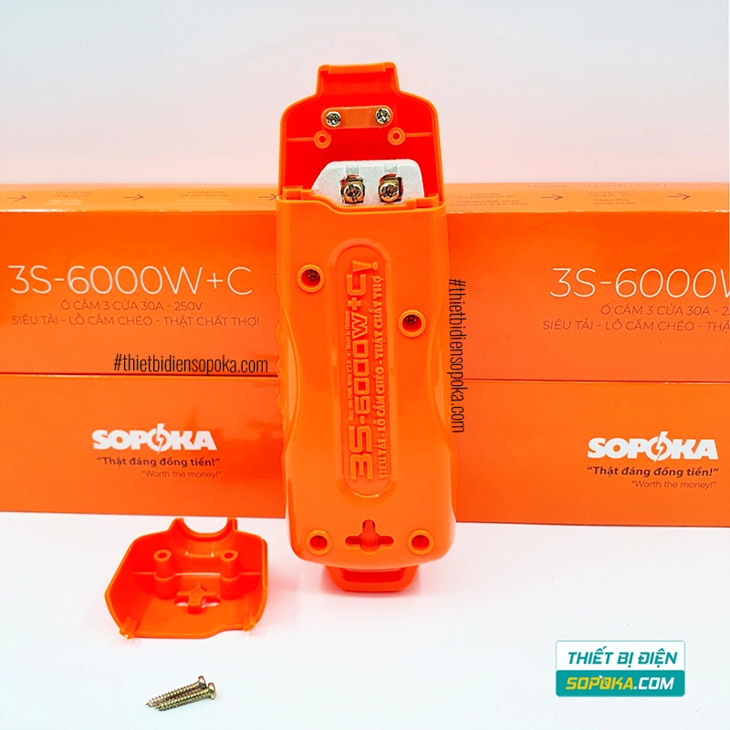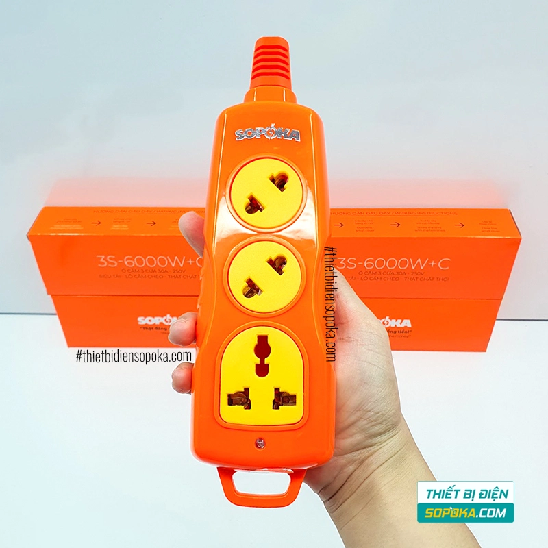 Ổ Cắm Điện Không Dây SOPOKA 3S-6000W+C là loại ổ cắm rời (không kèm dây) định mức 30A–250V, công suất đến 6000W, thiết kế “3 lỗ chéo” giúp cắm đồng thời nhiều phích mà giảm tình trạng chạm/vướng nhau.